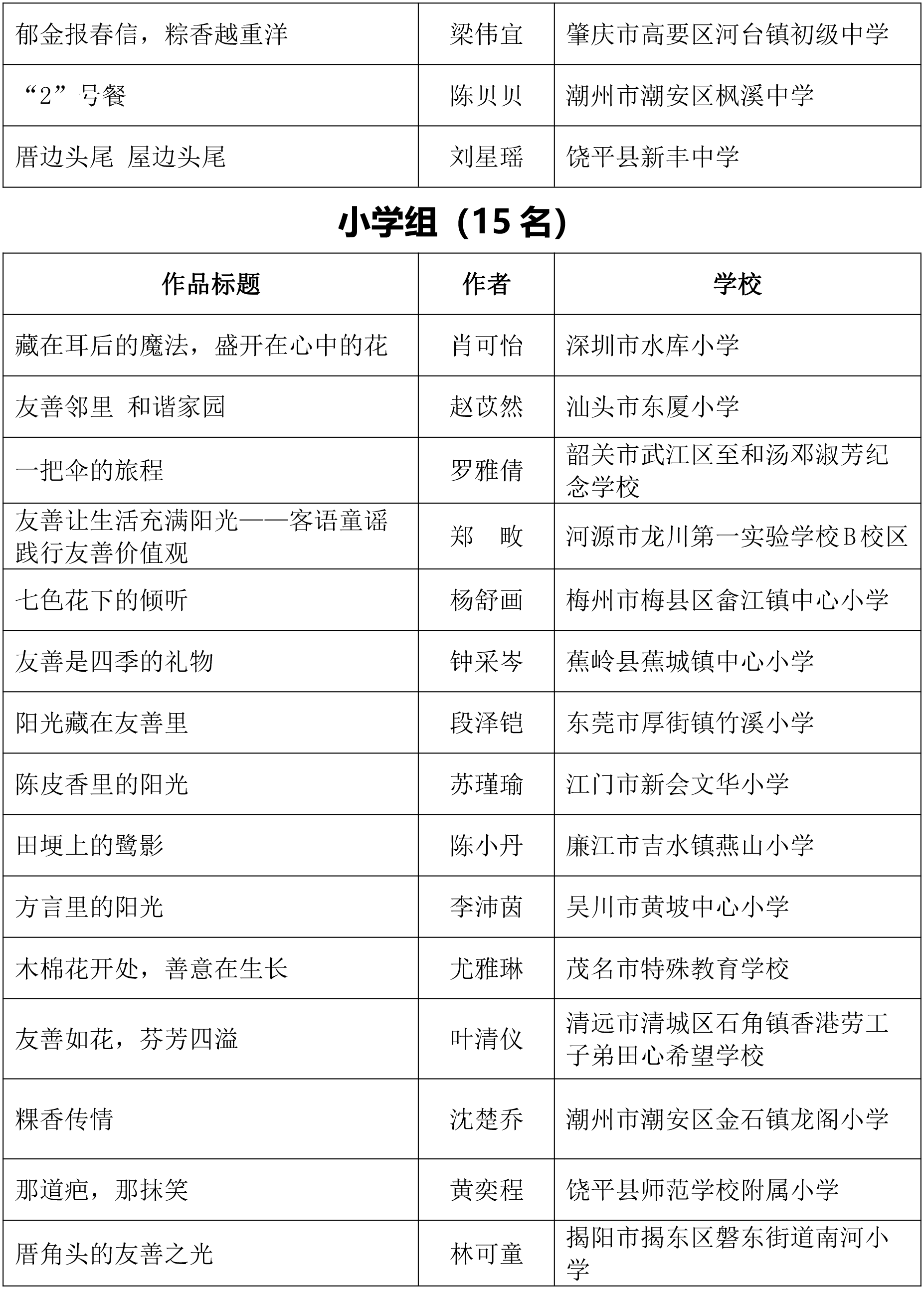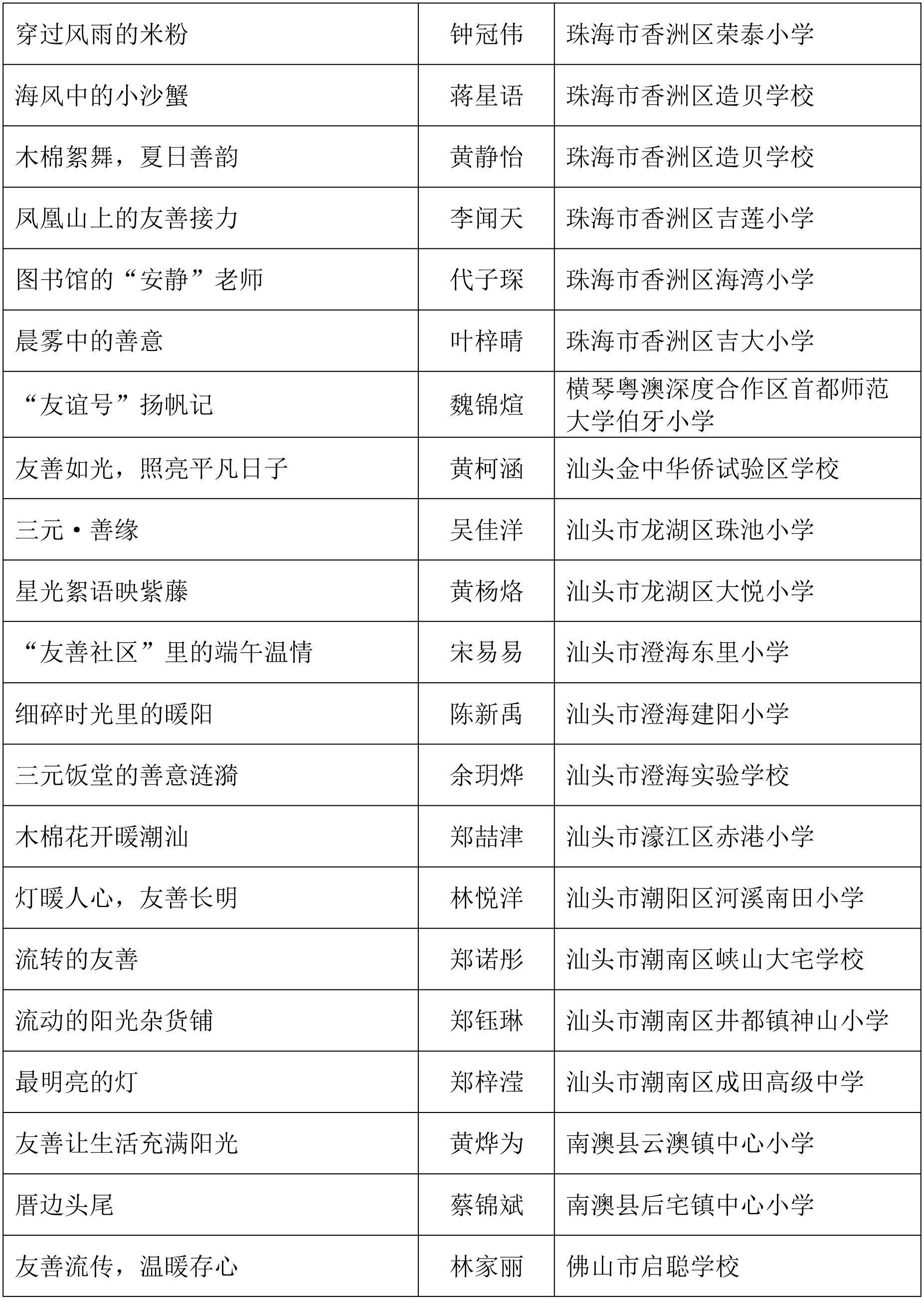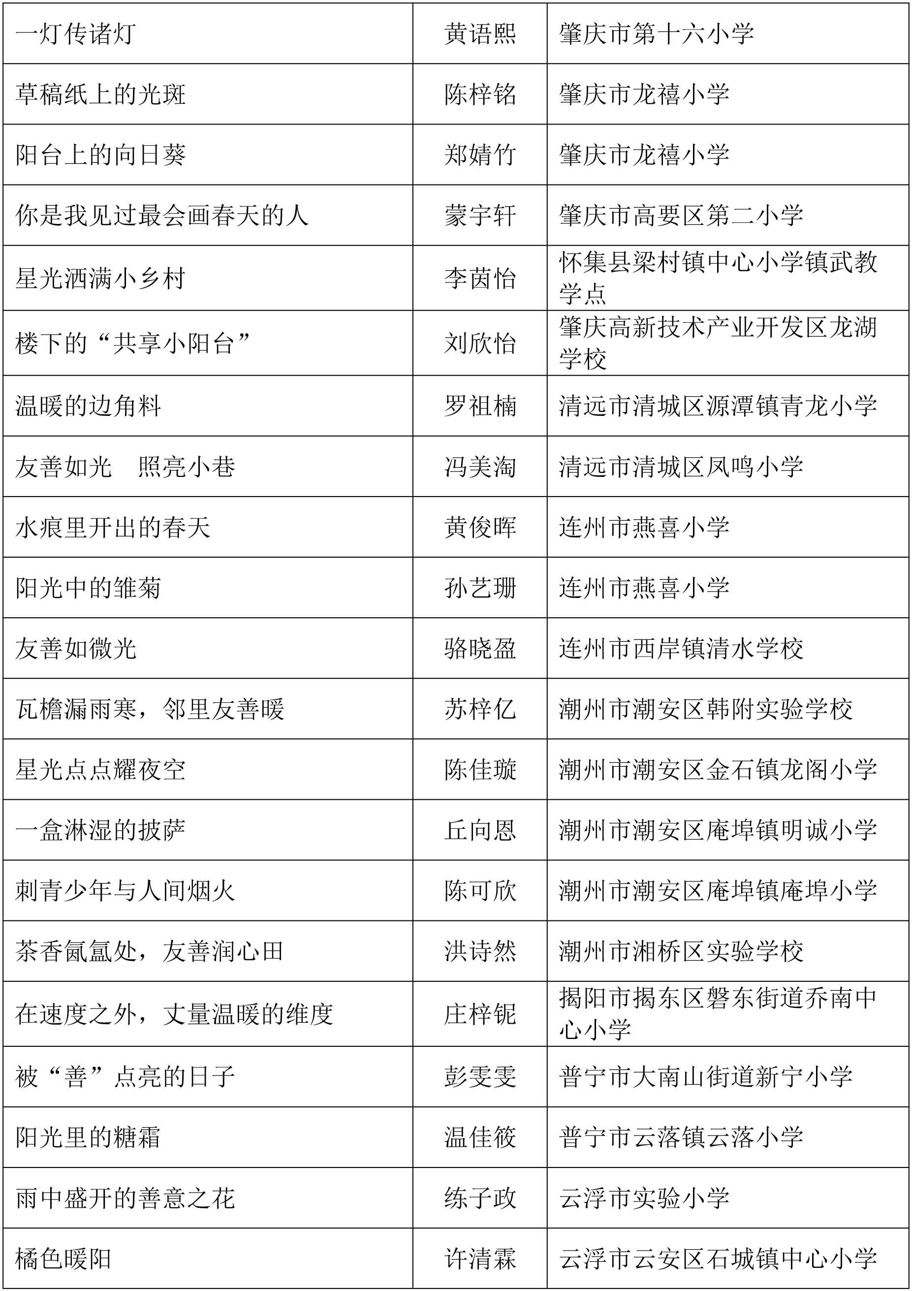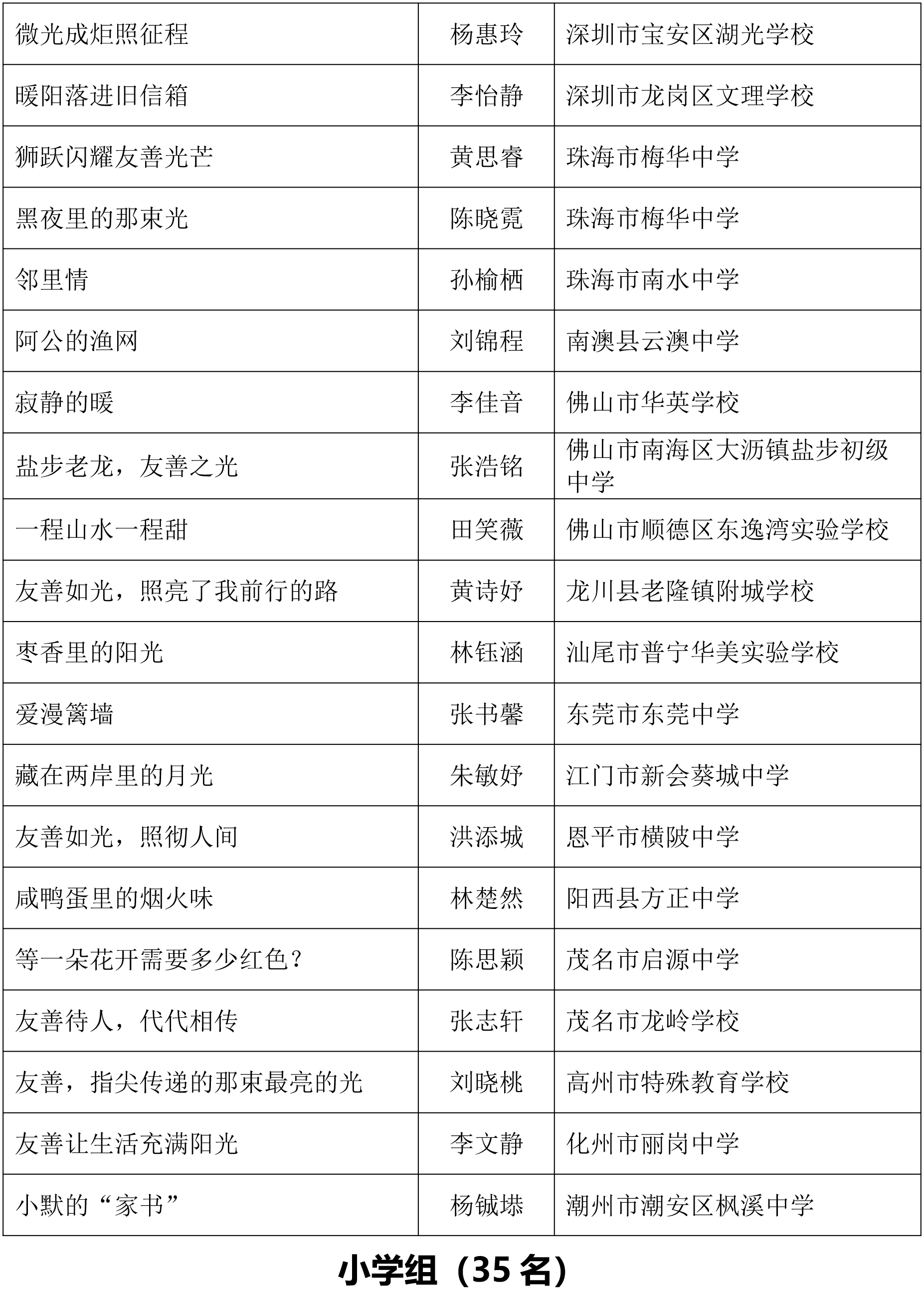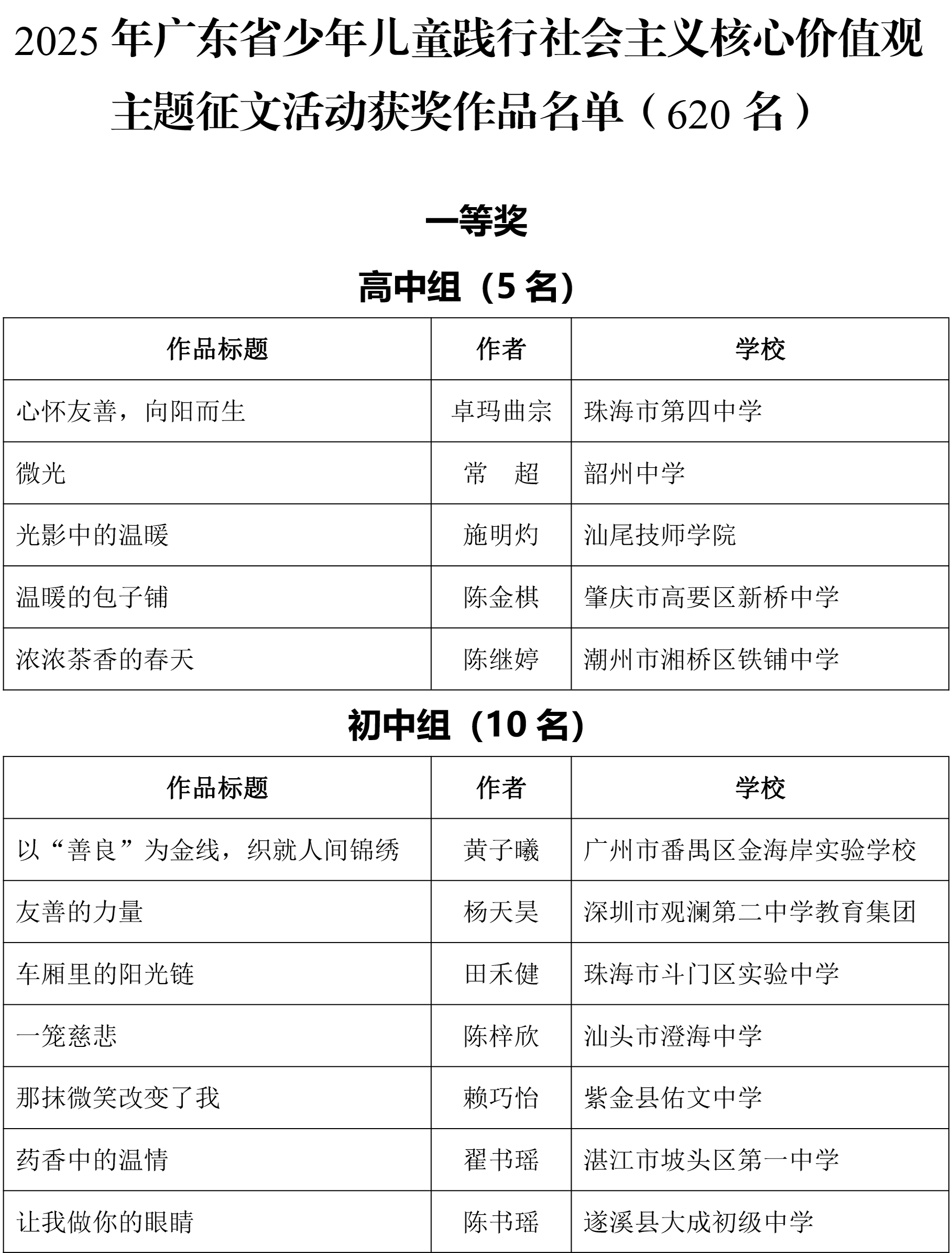 由广东省关心下一代工作委员会、广东省作家协会、广东省教育系统关心下一代工作委员会主办,《秋光》杂志社承办,《少男少女》杂志社协办的2025年广东省少年儿童践行社会主义核心价值观主题征文活动,于今年2月启动,在全省各级关工委、作家协会、教育部门和广大青少年的共同努力下,取得丰硕成果。参与征文活动的青少年达130多万人次,经各地市初评后报送组委会的文章共5868篇,组委会组织了由作家、编辑和教育工作者组成的专业评审队伍,本着公平、公正、公开的原则,通过复评和终评,按照小学、初中、高中三个组别各评出一、二、三等奖及优秀奖共620篇。其中,高中组一等奖5篇、二等奖10篇、三等奖30篇、优秀奖50篇;初中组一等奖10篇、二等奖25篇、三等奖70篇、优秀奖110篇;小学组一等奖15篇、二等奖35篇、三等奖100篇、优秀奖160篇。