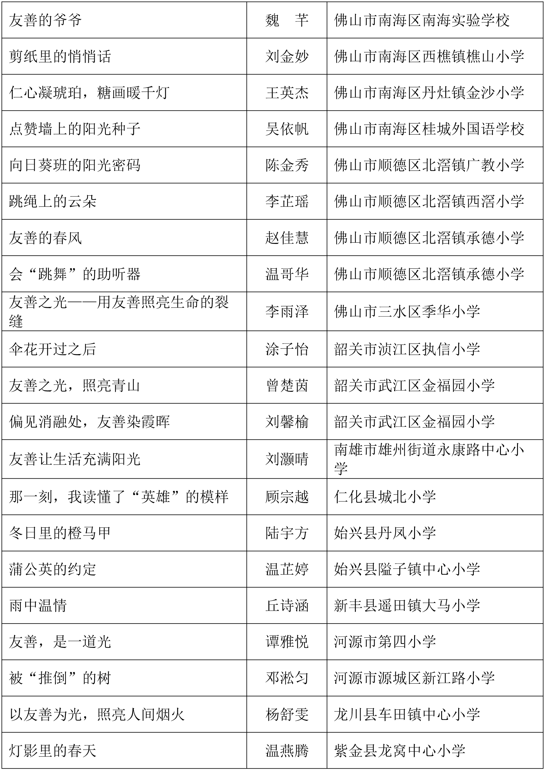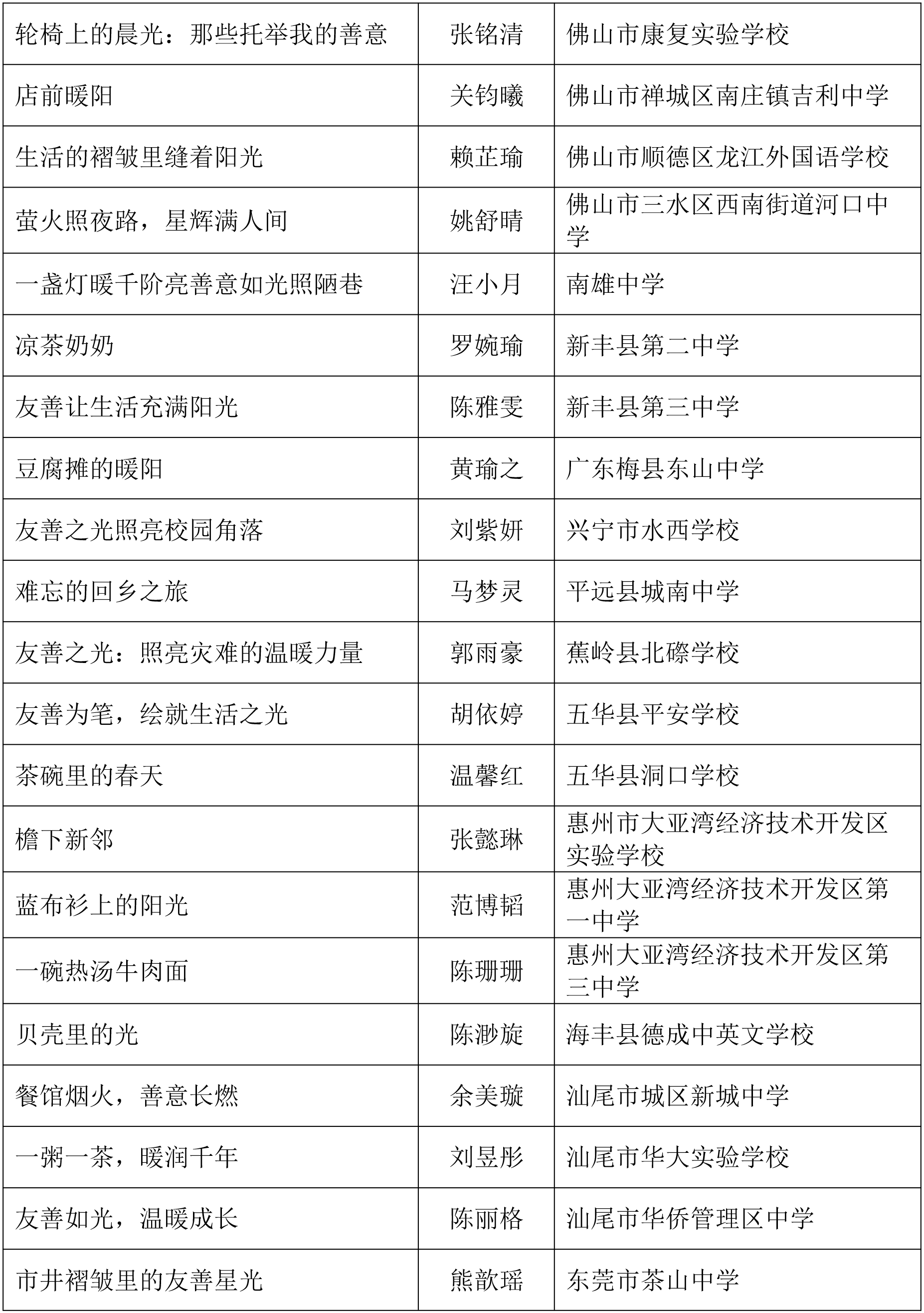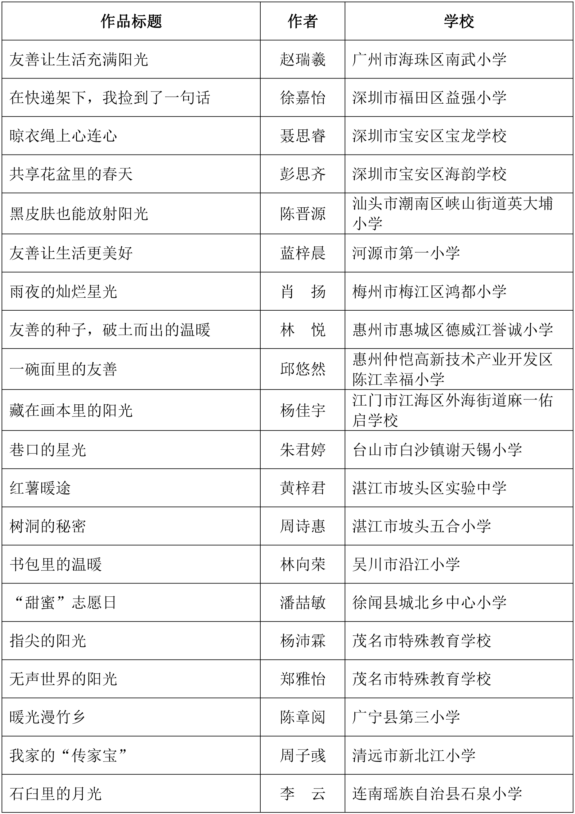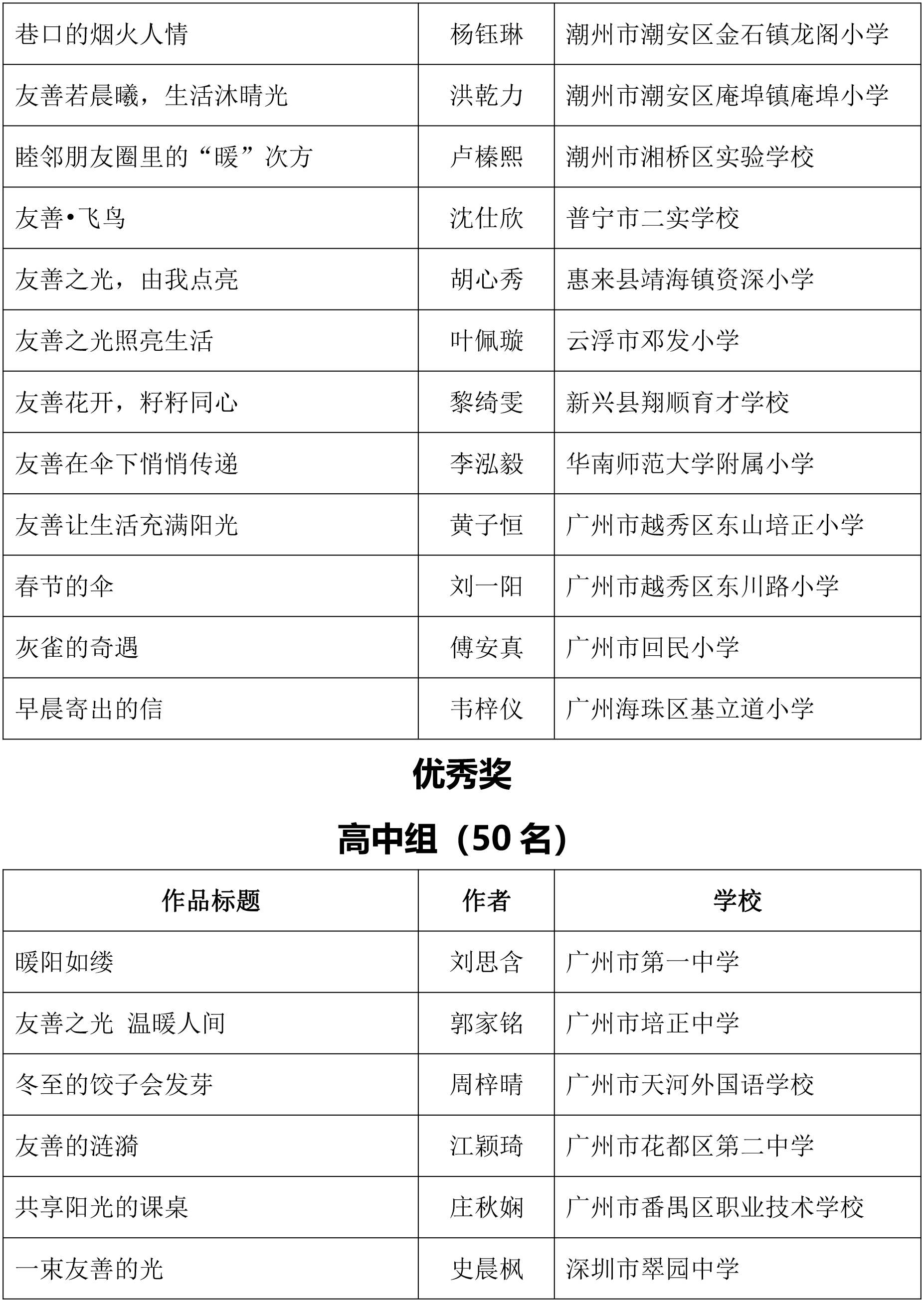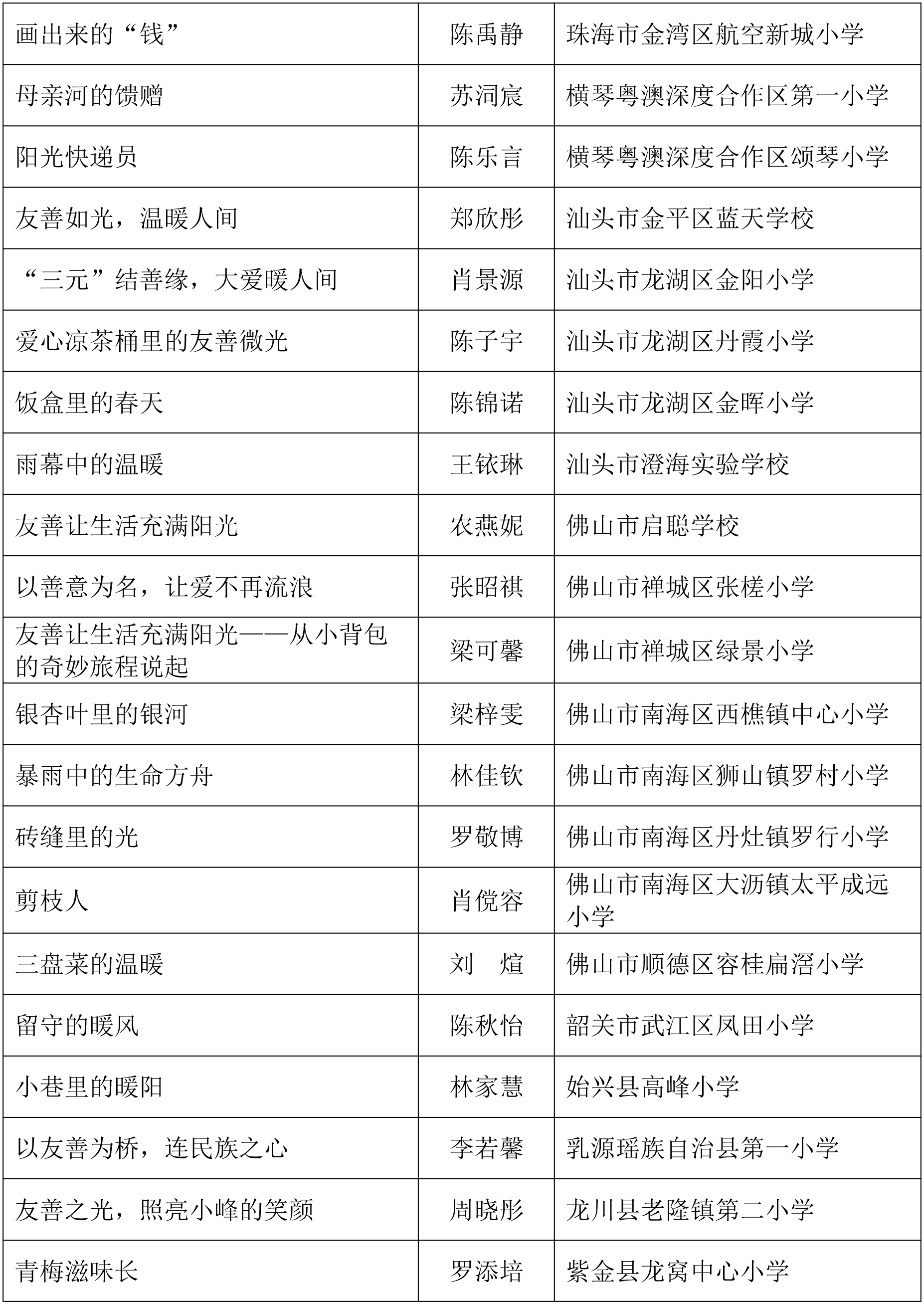 由广东省关心下一代工作委员会、广东省作家协会、广东省教育系统关心下一代工作委员会主办,《秋光》杂志社承办,《少男少女》杂志社协办的2025年广东省少年儿童践行社会主义核心价值观主题征文活动,于今年2月启动,在全省各级关工委、作家协会、教育部门和广大青少年的共同努力下,取得丰硕成果。参与征文活动的青少年达130多万人次,经各地市初评后报送组委会的文章共5868篇,组委会组织了由作家、编辑和教育工作者组成的专业评审队伍,本着公平、公正、公开的原则,通过复评和终评,按照小学、初中、高中三个组别各评出一、二、三等奖及优秀奖共620篇。其中,高中组一等奖5篇、二等奖10篇、三等奖30篇、优秀奖50篇;初中组一等奖10篇、二等奖25篇、三等奖70篇、优秀奖110篇;小学组一等奖15篇、二等奖35篇、三等奖100篇、优秀奖160篇。