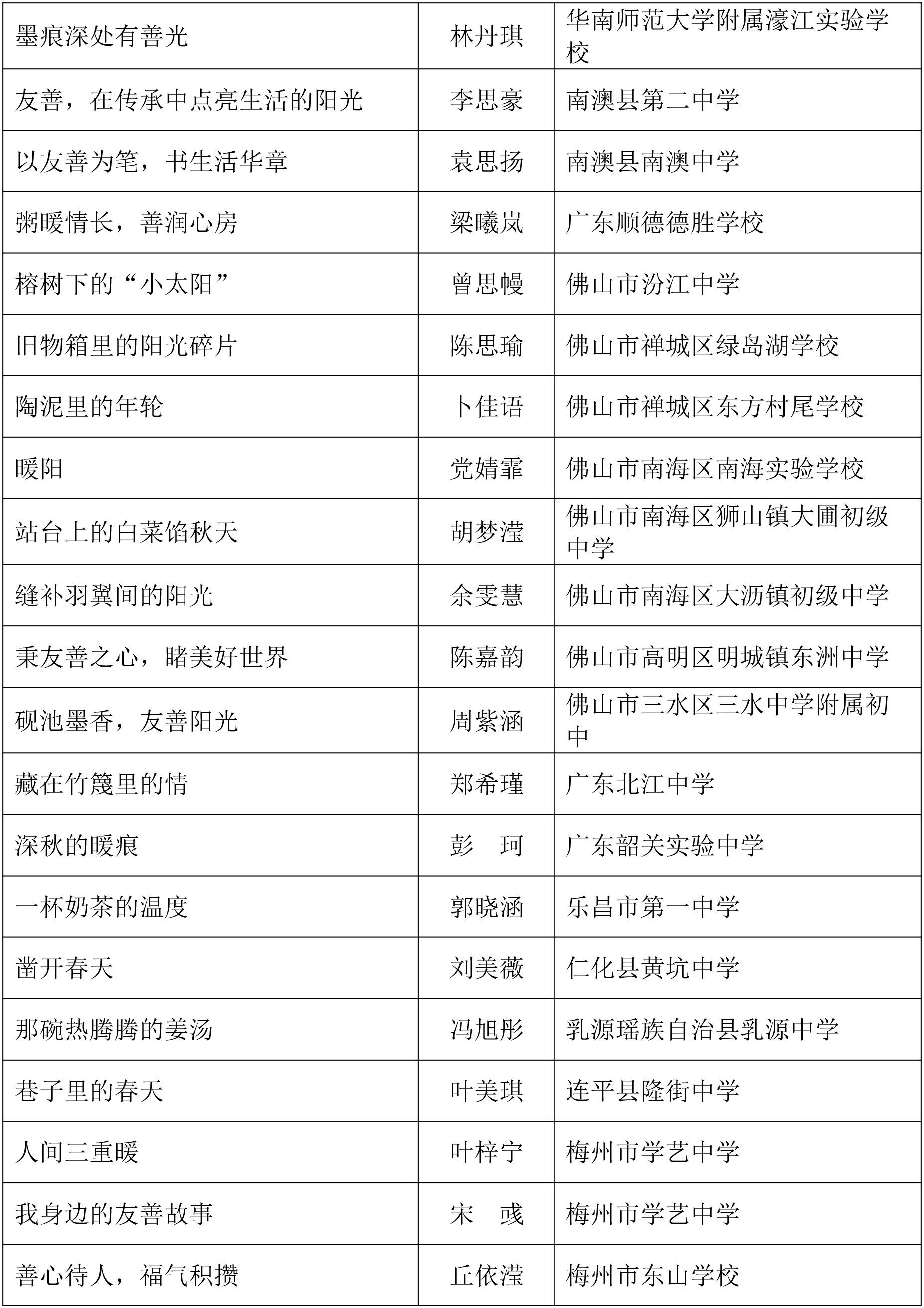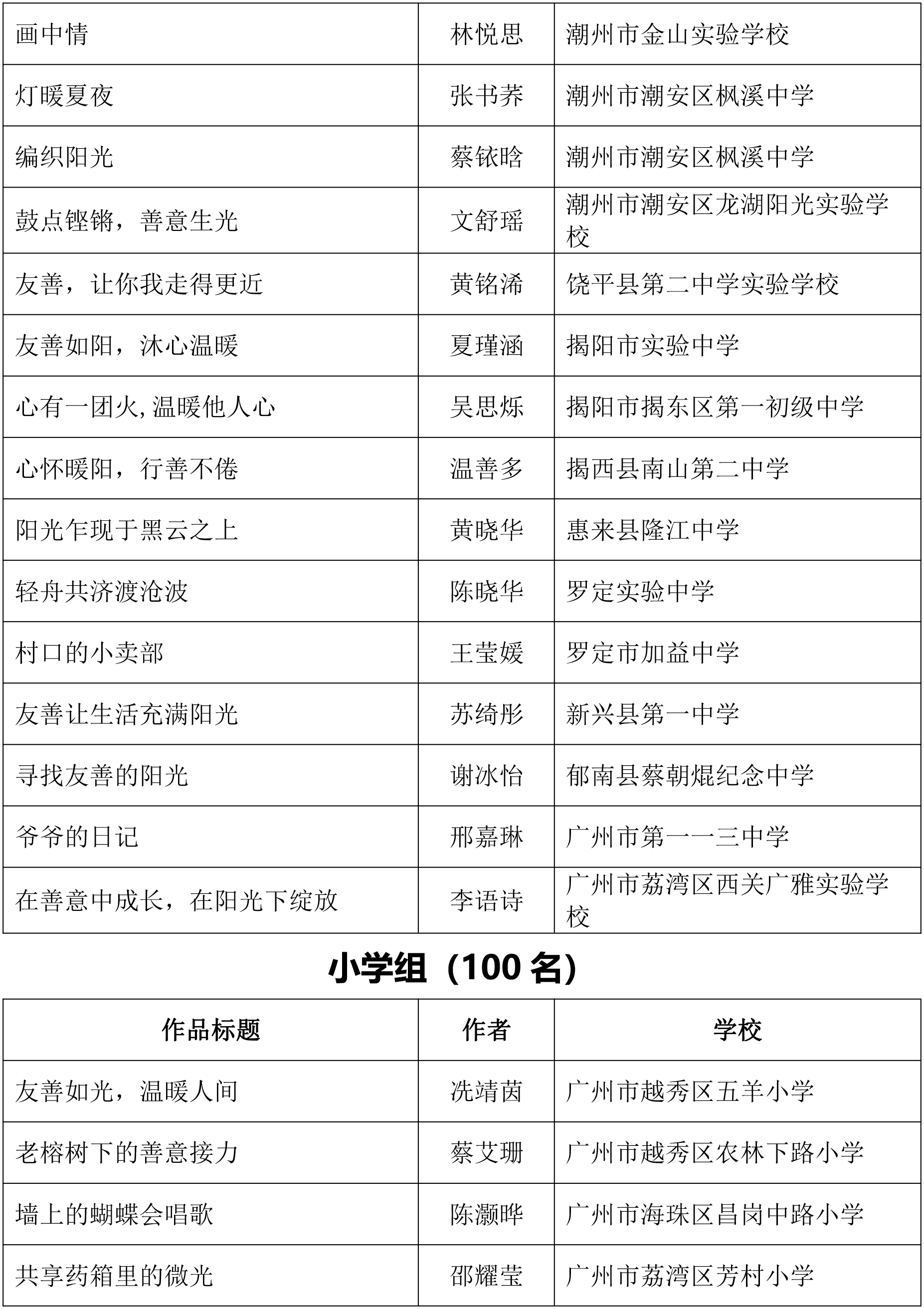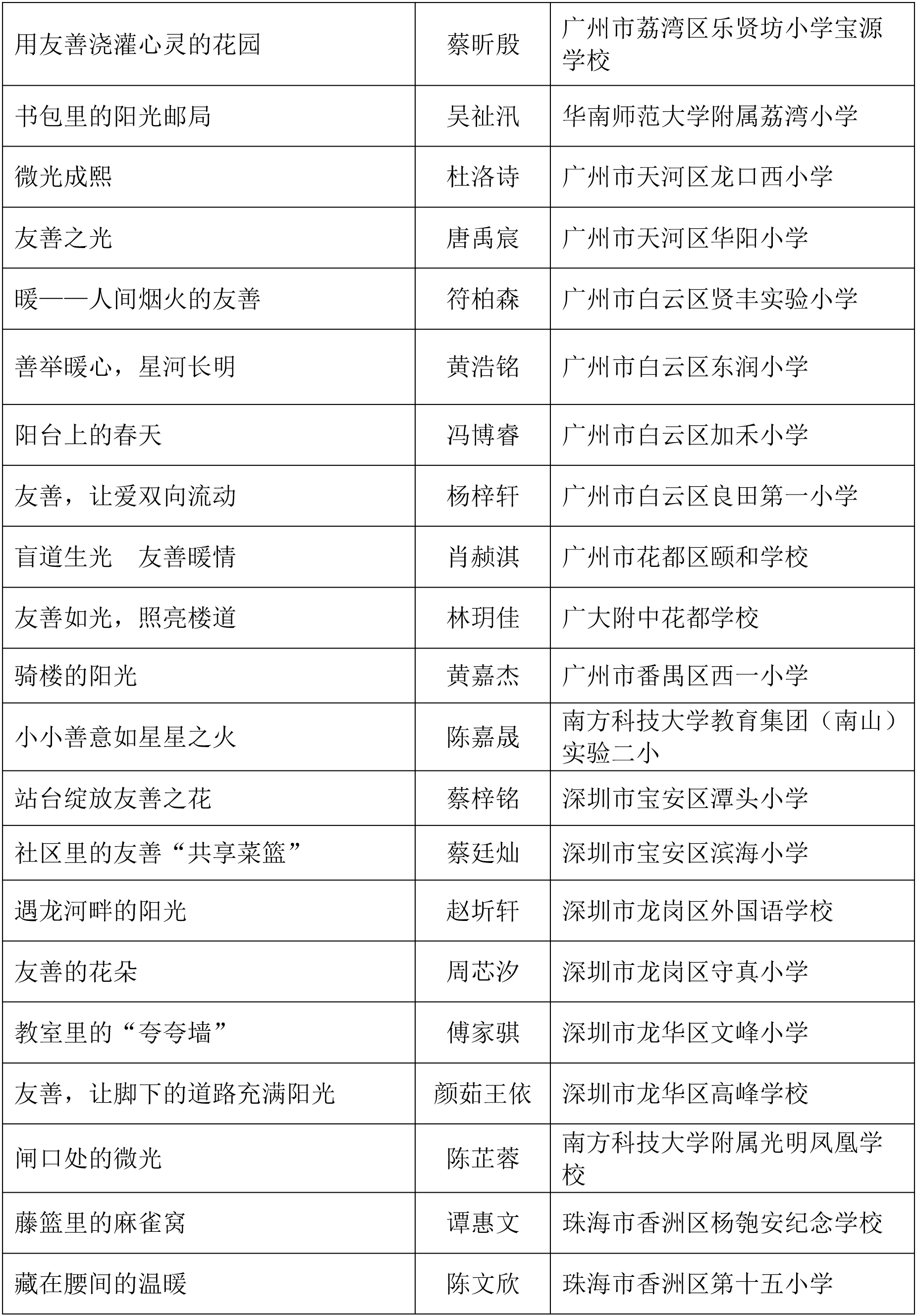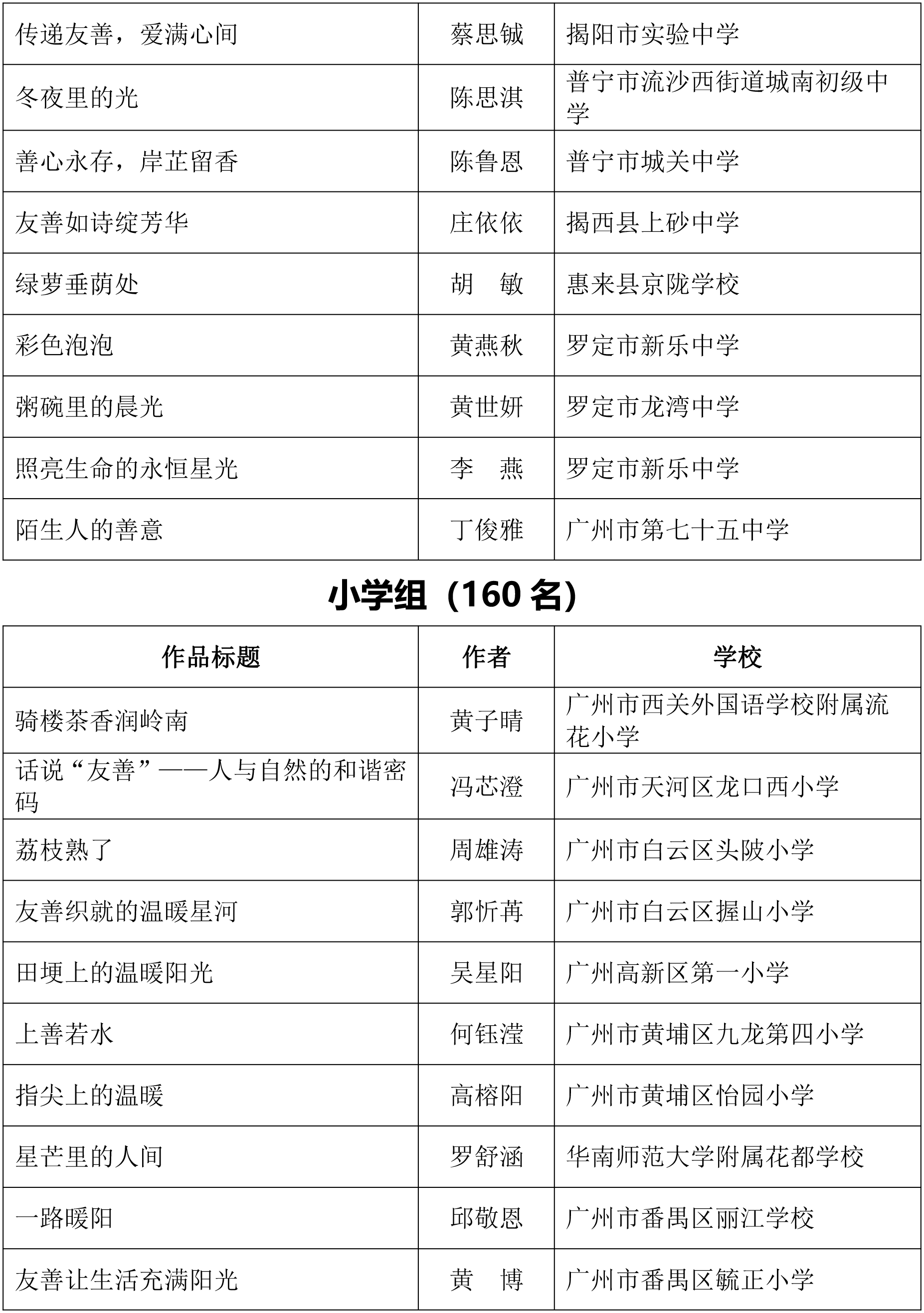 由广东省关心下一代工作委员会、广东省作家协会、广东省教育系统关心下一代工作委员会主办,《秋光》杂志社承办,《少男少女》杂志社协办的2025年广东省少年儿童践行社会主义核心价值观主题征文活动,于今年2月启动,在全省各级关工委、作家协会、教育部门和广大青少年的共同努力下,取得丰硕成果。参与征文活动的青少年达130多万人次,经各地市初评后报送组委会的文章共5868篇,组委会组织了由作家、编辑和教育工作者组成的专业评审队伍,本着公平、公正、公开的原则,通过复评和终评,按照小学、初中、高中三个组别各评出一、二、三等奖及优秀奖共620篇。其中,高中组一等奖5篇、二等奖10篇、三等奖30篇、优秀奖50篇;初中组一等奖10篇、二等奖25篇、三等奖70篇、优秀奖110篇;小学组一等奖15篇、二等奖35篇、三等奖100篇、优秀奖160篇。