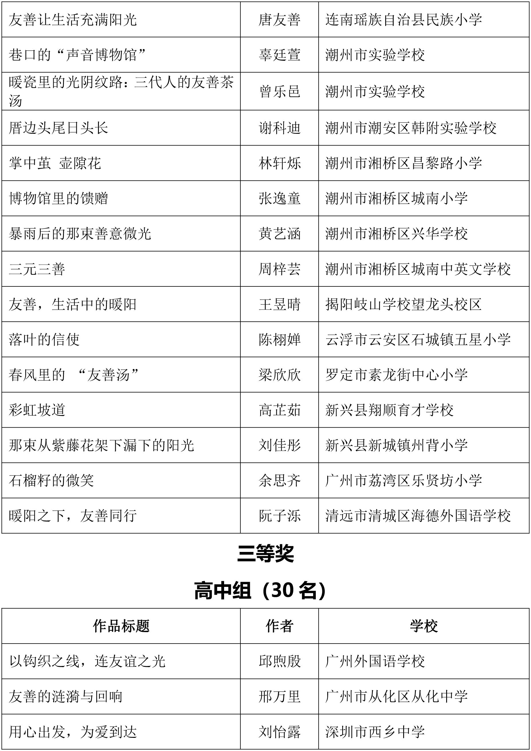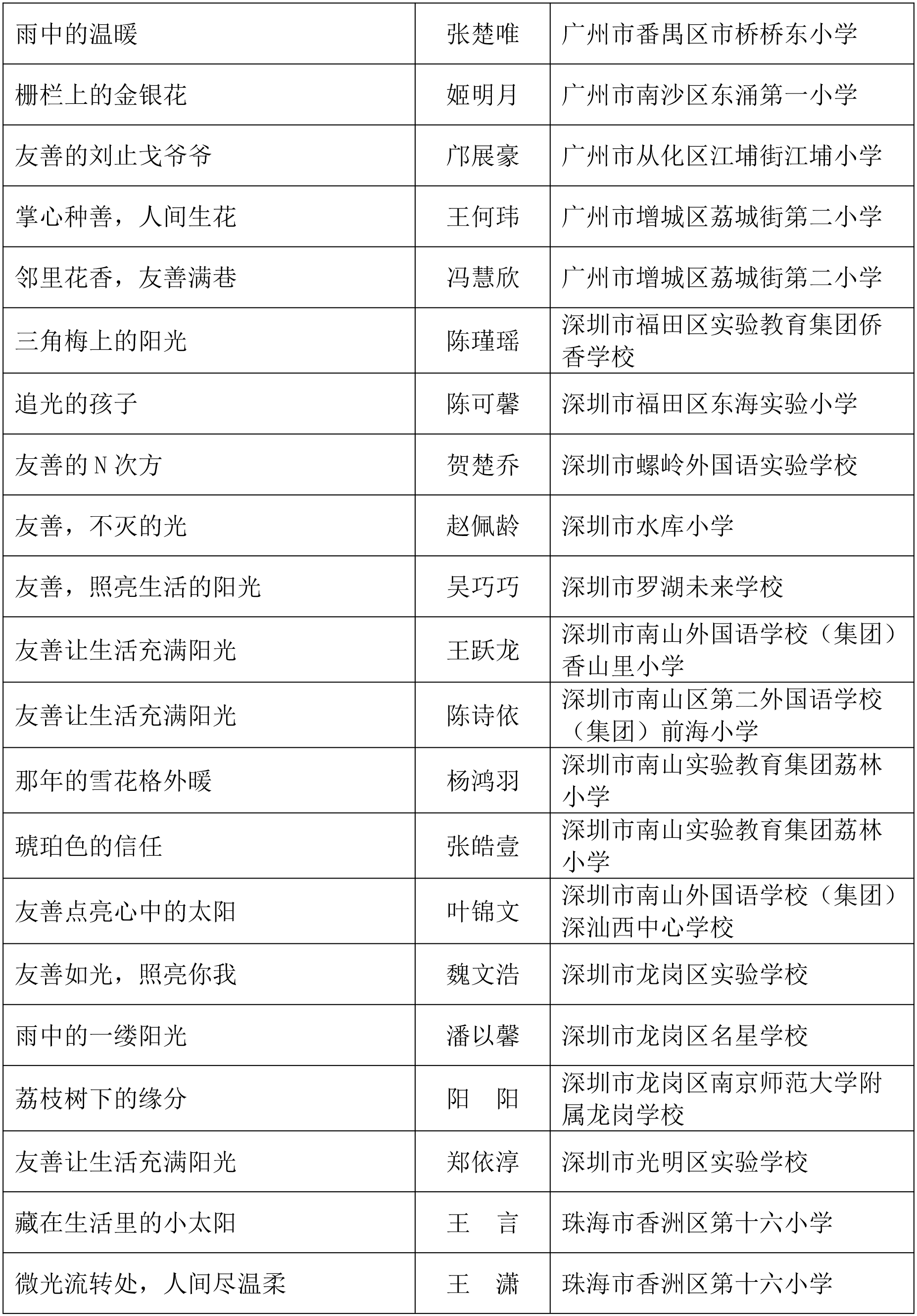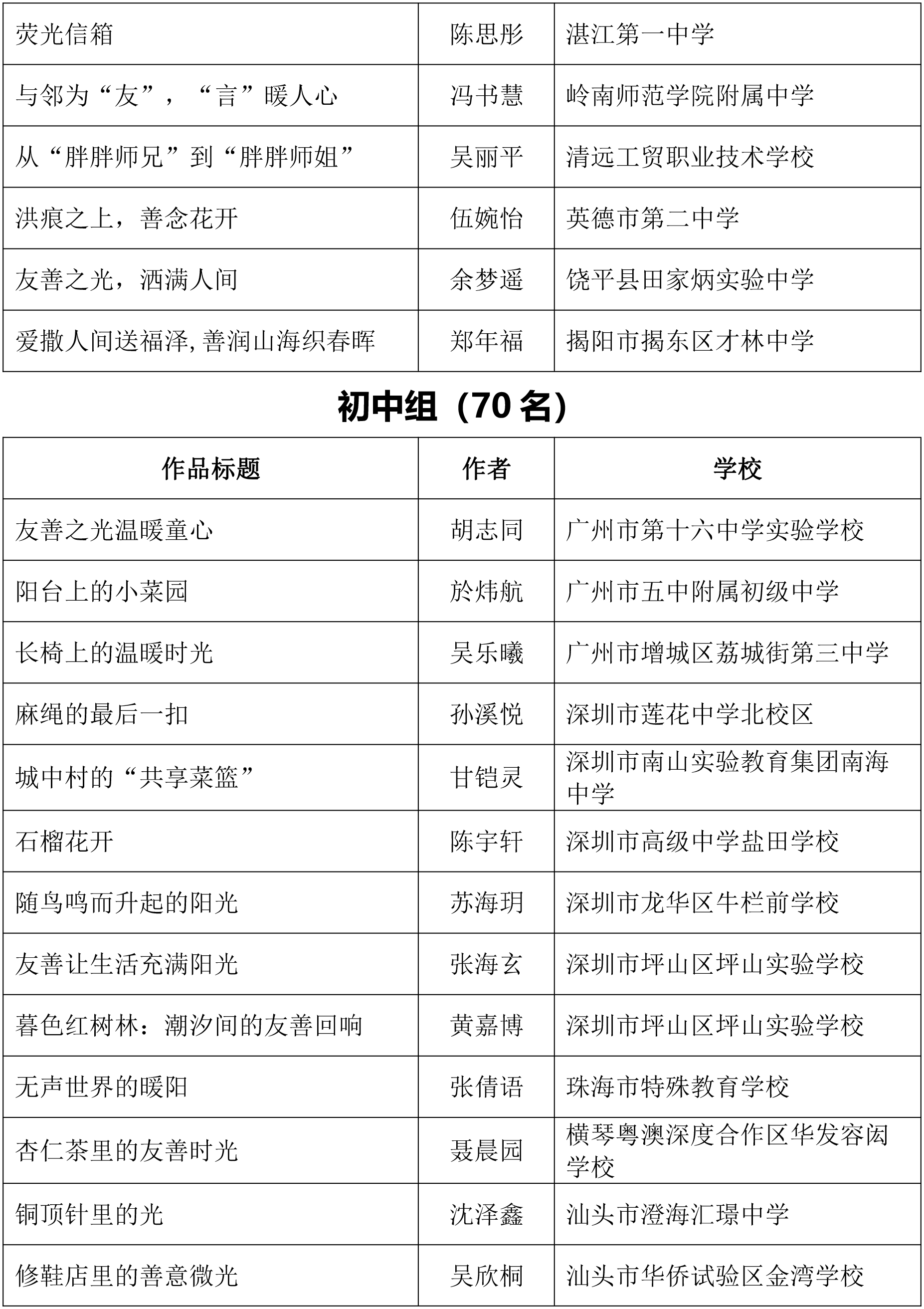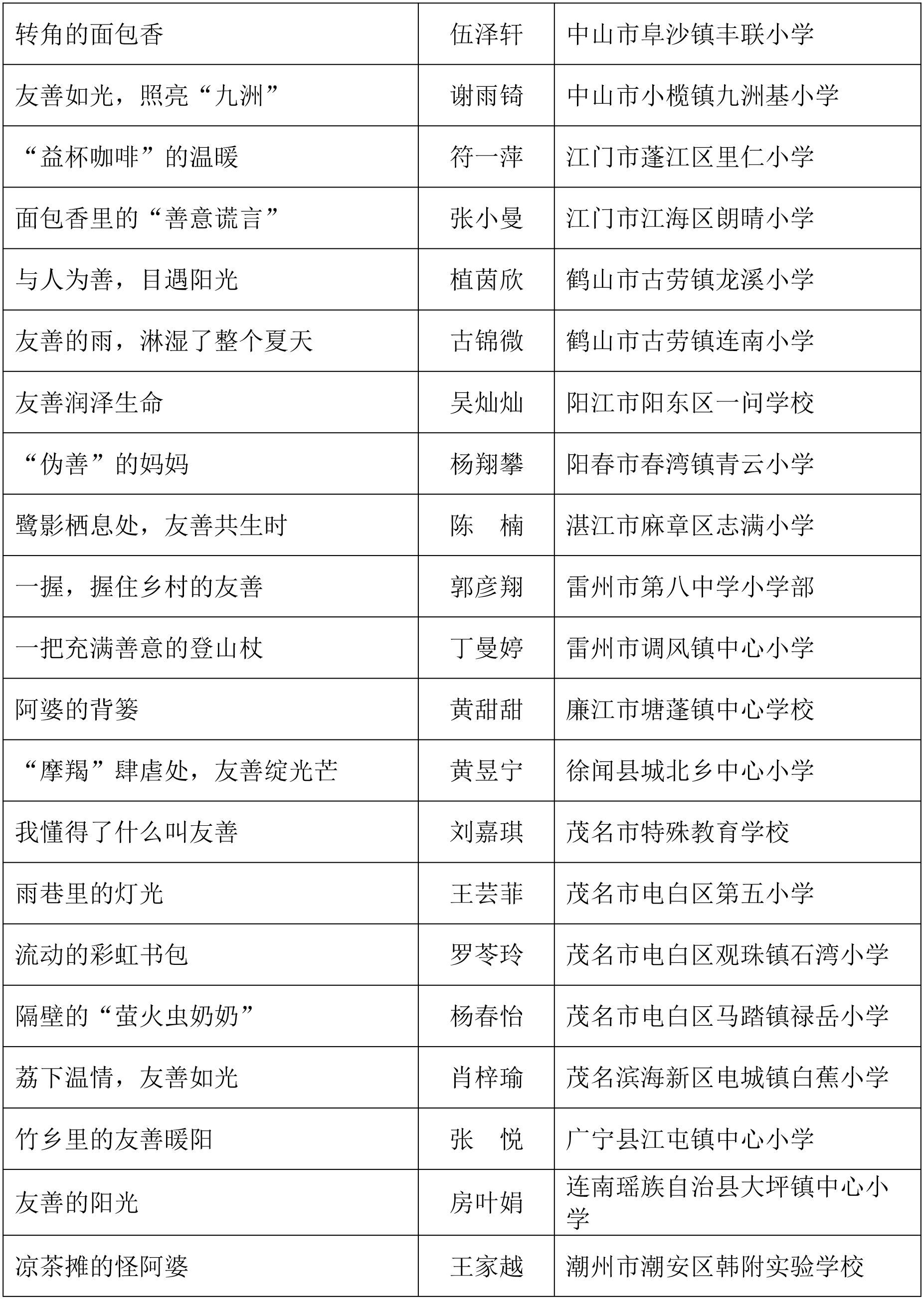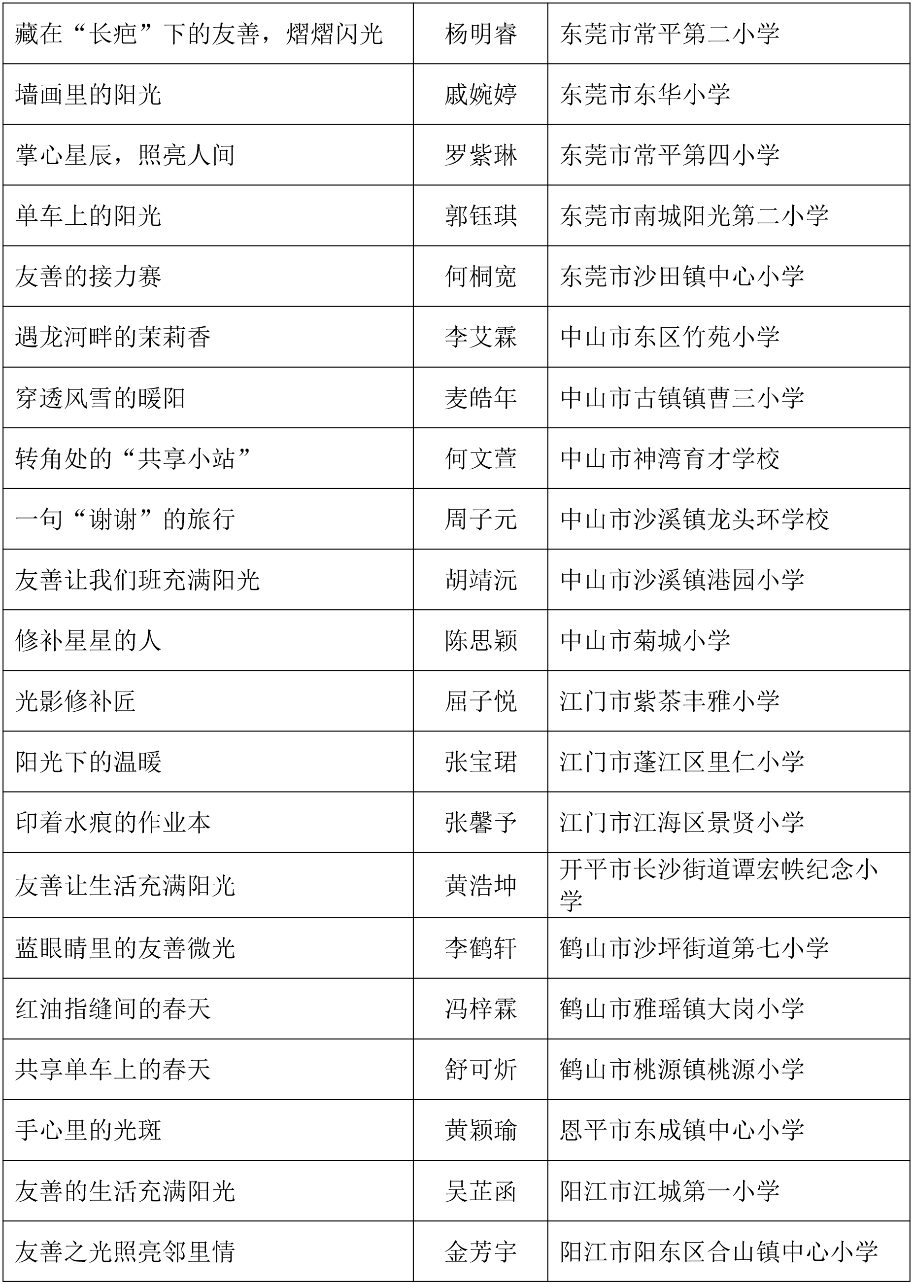 由广东省关心下一代工作委员会、广东省作家协会、广东省教育系统关心下一代工作委员会主办,《秋光》杂志社承办,《少男少女》杂志社协办的2025年广东省少年儿童践行社会主义核心价值观主题征文活动,于今年2月启动,在全省各级关工委、作家协会、教育部门和广大青少年的共同努力下,取得丰硕成果。参与征文活动的青少年达130多万人次,经各地市初评后报送组委会的文章共5868篇,组委会组织了由作家、编辑和教育工作者组成的专业评审队伍,本着公平、公正、公开的原则,通过复评和终评,按照小学、初中、高中三个组别各评出一、二、三等奖及优秀奖共620篇。其中,高中组一等奖5篇、二等奖10篇、三等奖30篇、优秀奖50篇;初中组一等奖10篇、二等奖25篇、三等奖70篇、优秀奖110篇;小学组一等奖15篇、二等奖35篇、三等奖100篇、优秀奖160篇。