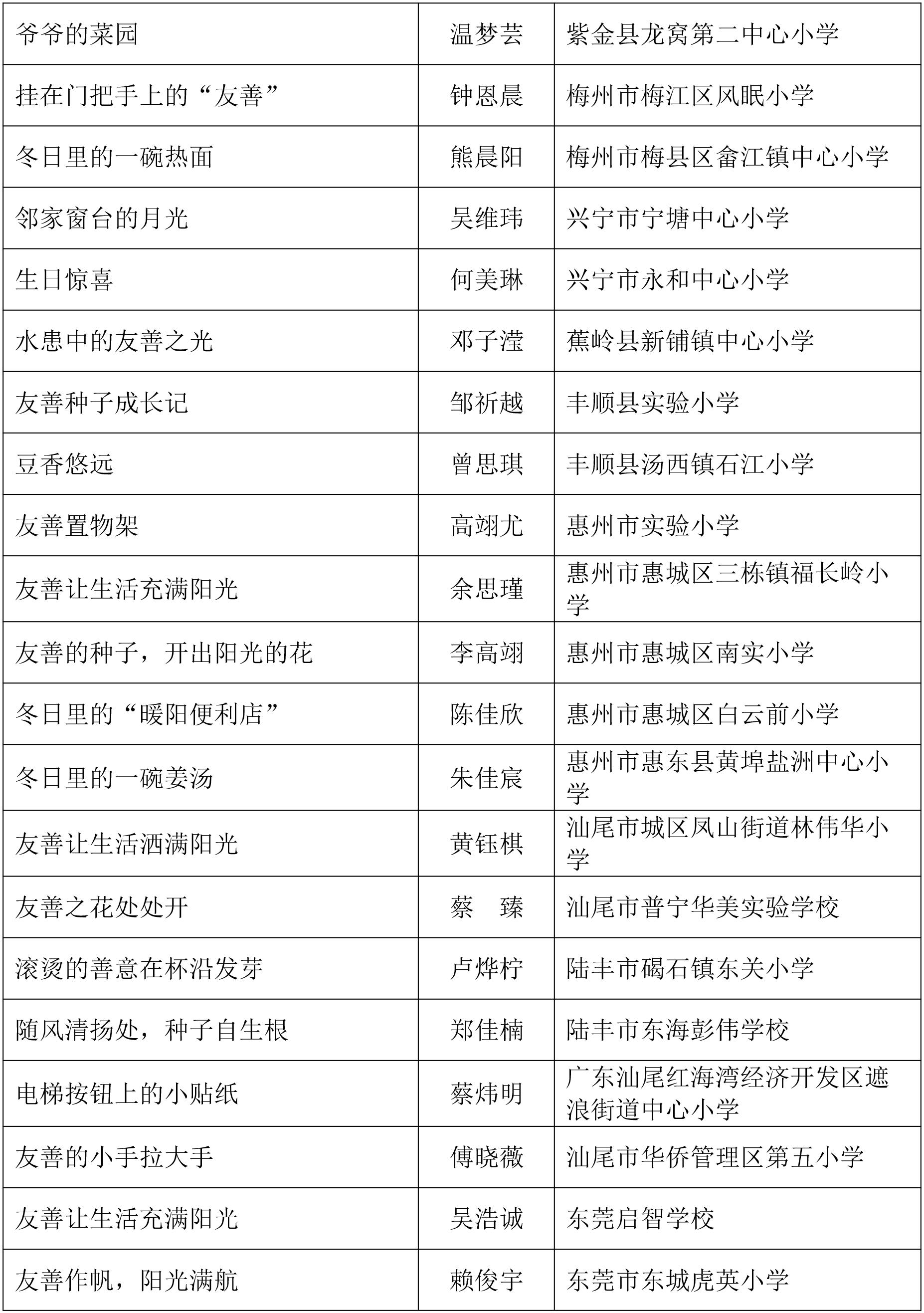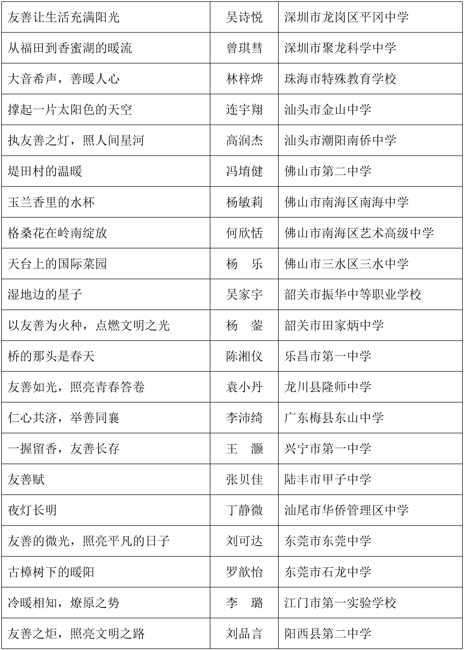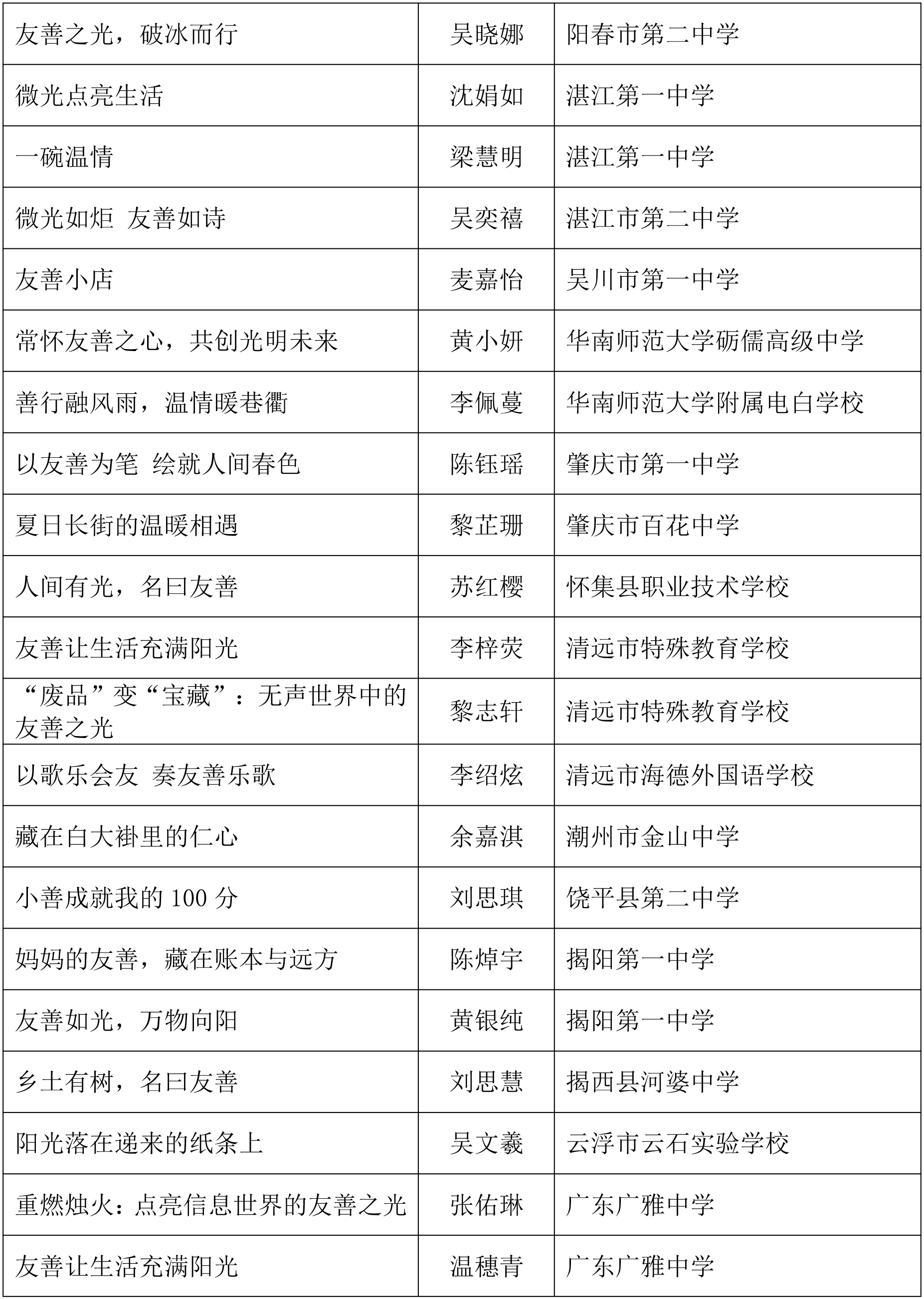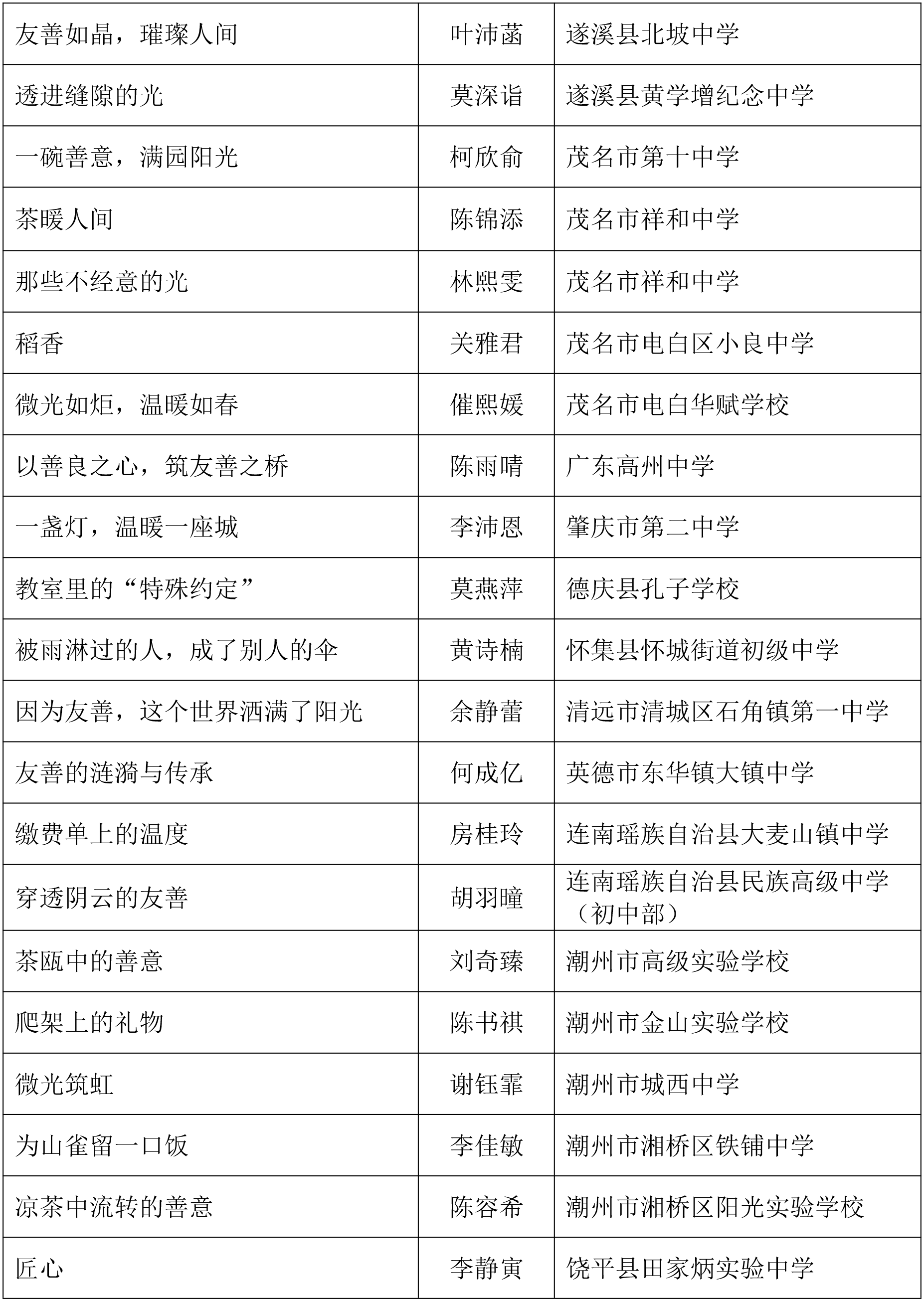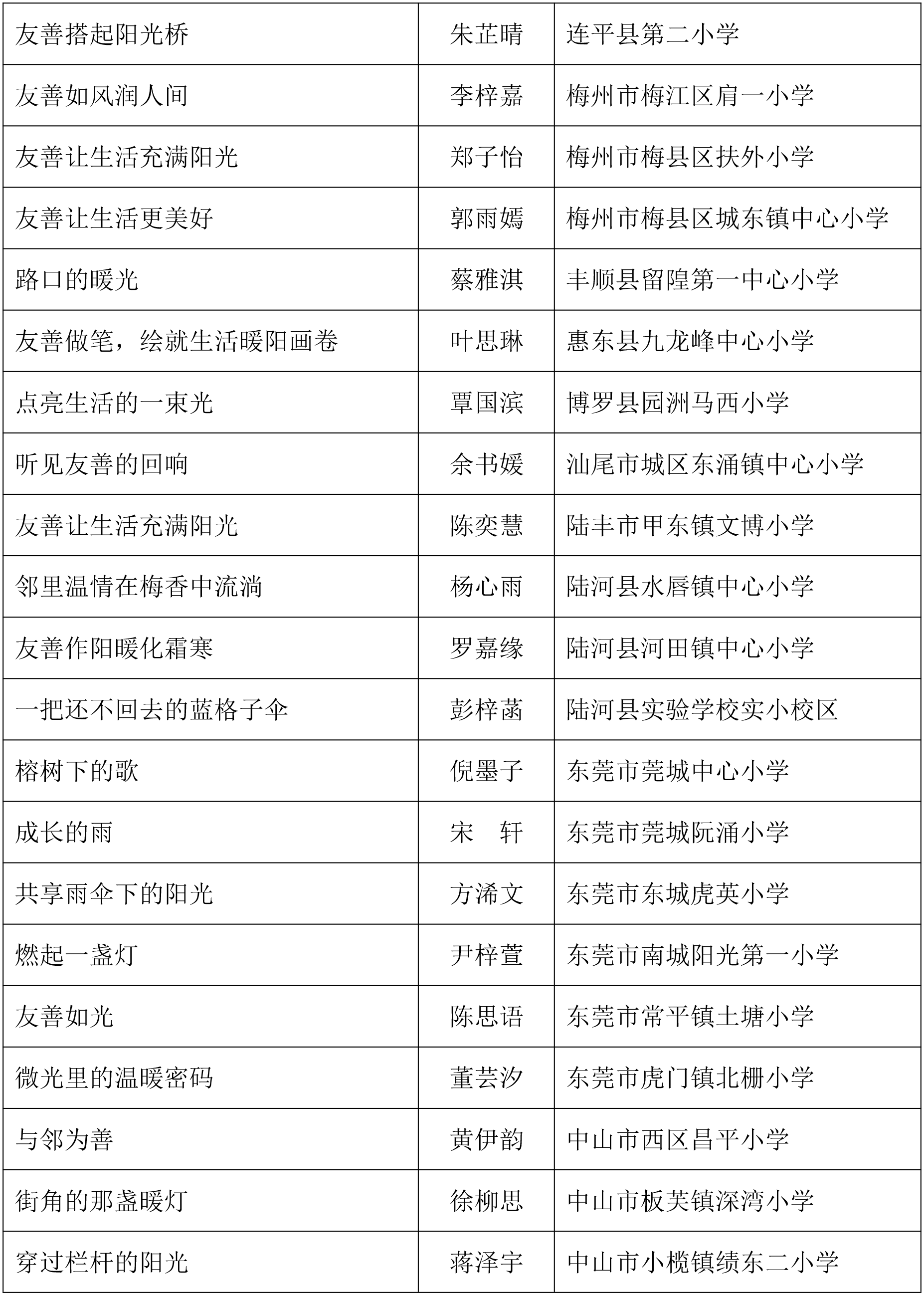 由广东省关心下一代工作委员会、广东省作家协会、广东省教育系统关心下一代工作委员会主办,《秋光》杂志社承办,《少男少女》杂志社协办的2025年广东省少年儿童践行社会主义核心价值观主题征文活动,于今年2月启动,在全省各级关工委、作家协会、教育部门和广大青少年的共同努力下,取得丰硕成果。参与征文活动的青少年达130多万人次,经各地市初评后报送组委会的文章共5868篇,组委会组织了由作家、编辑和教育工作者组成的专业评审队伍,本着公平、公正、公开的原则,通过复评和终评,按照小学、初中、高中三个组别各评出一、二、三等奖及优秀奖共620篇。其中,高中组一等奖5篇、二等奖10篇、三等奖30篇、优秀奖50篇;初中组一等奖10篇、二等奖25篇、三等奖70篇、优秀奖110篇;小学组一等奖15篇、二等奖35篇、三等奖100篇、优秀奖160篇。
