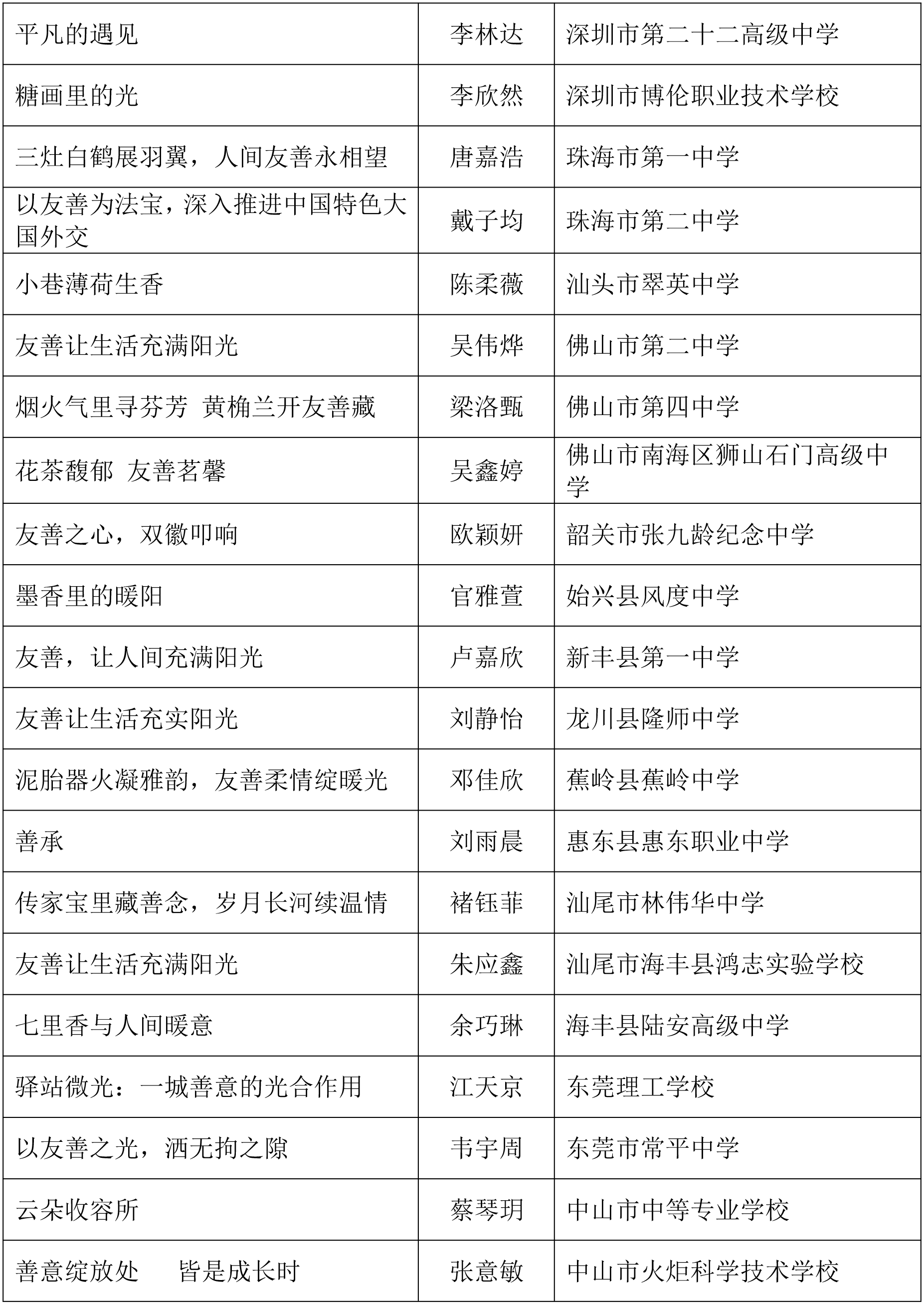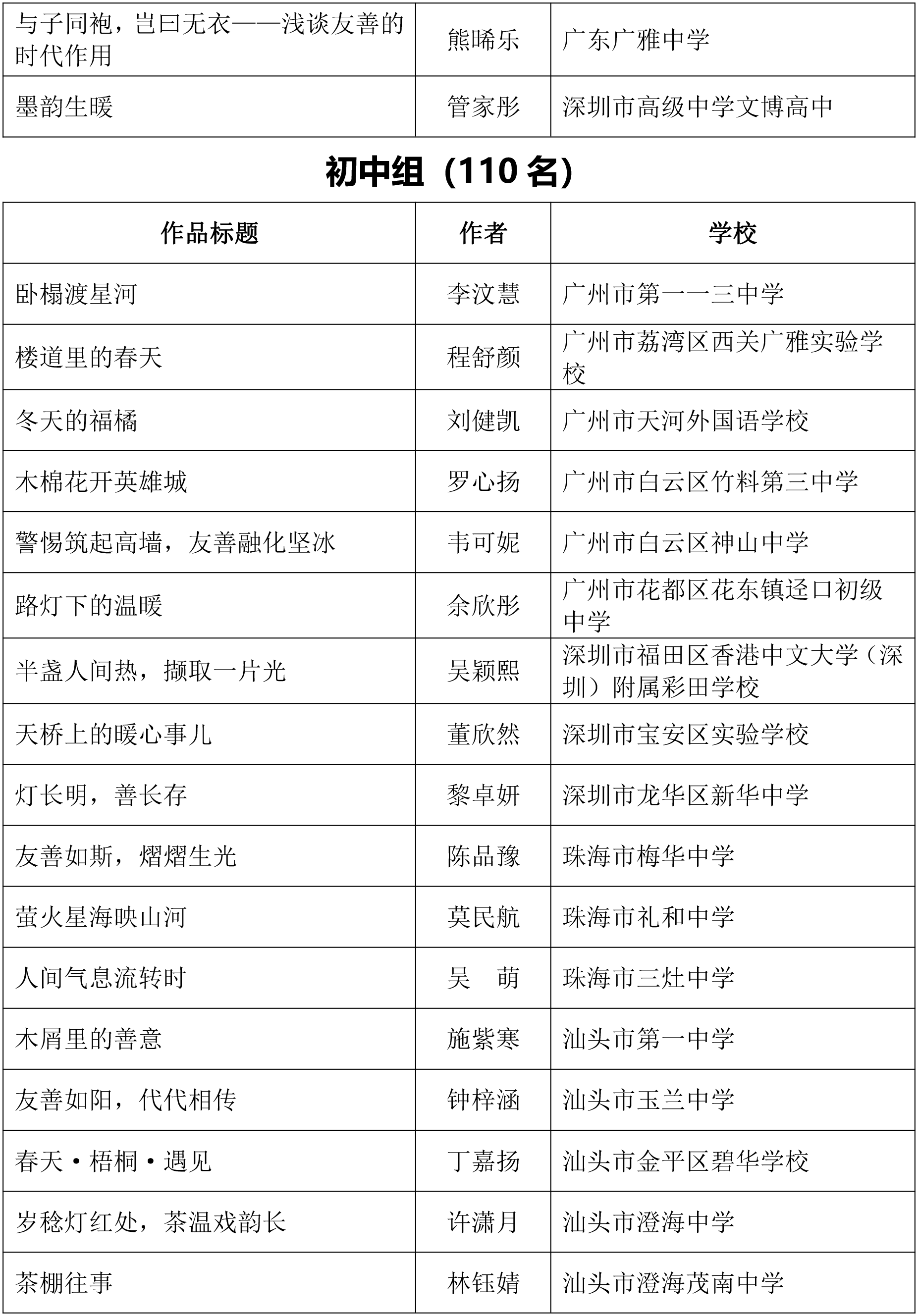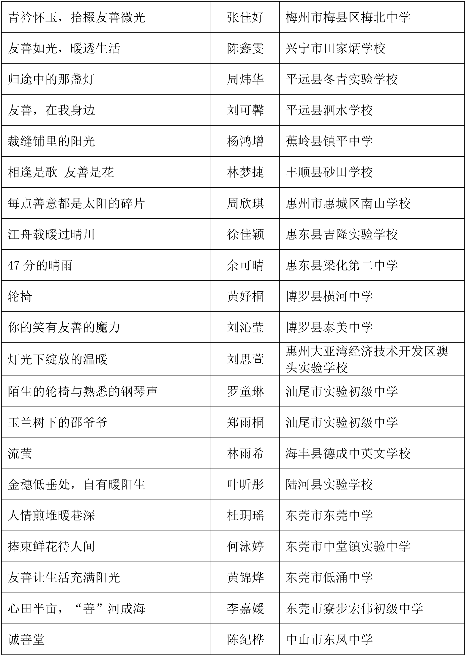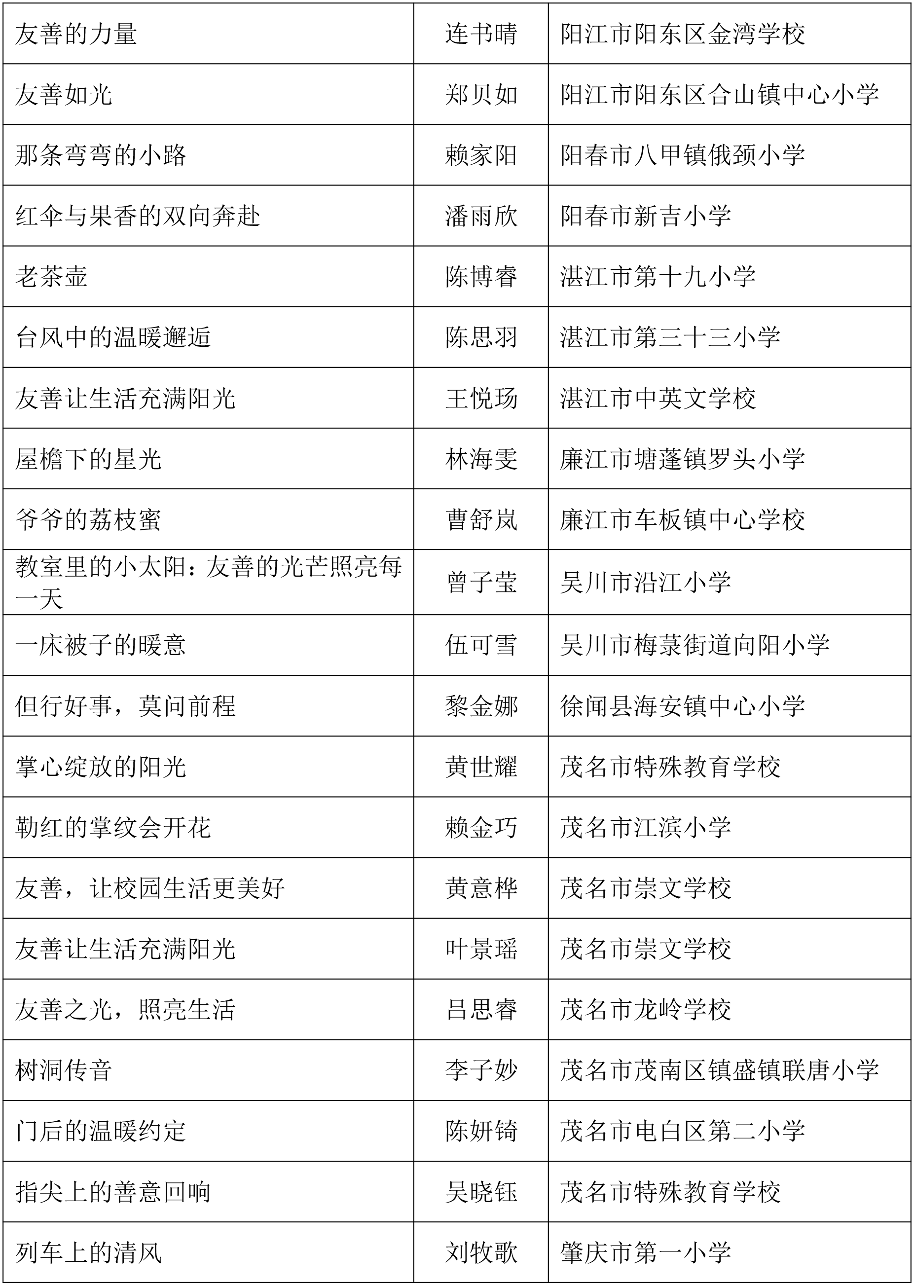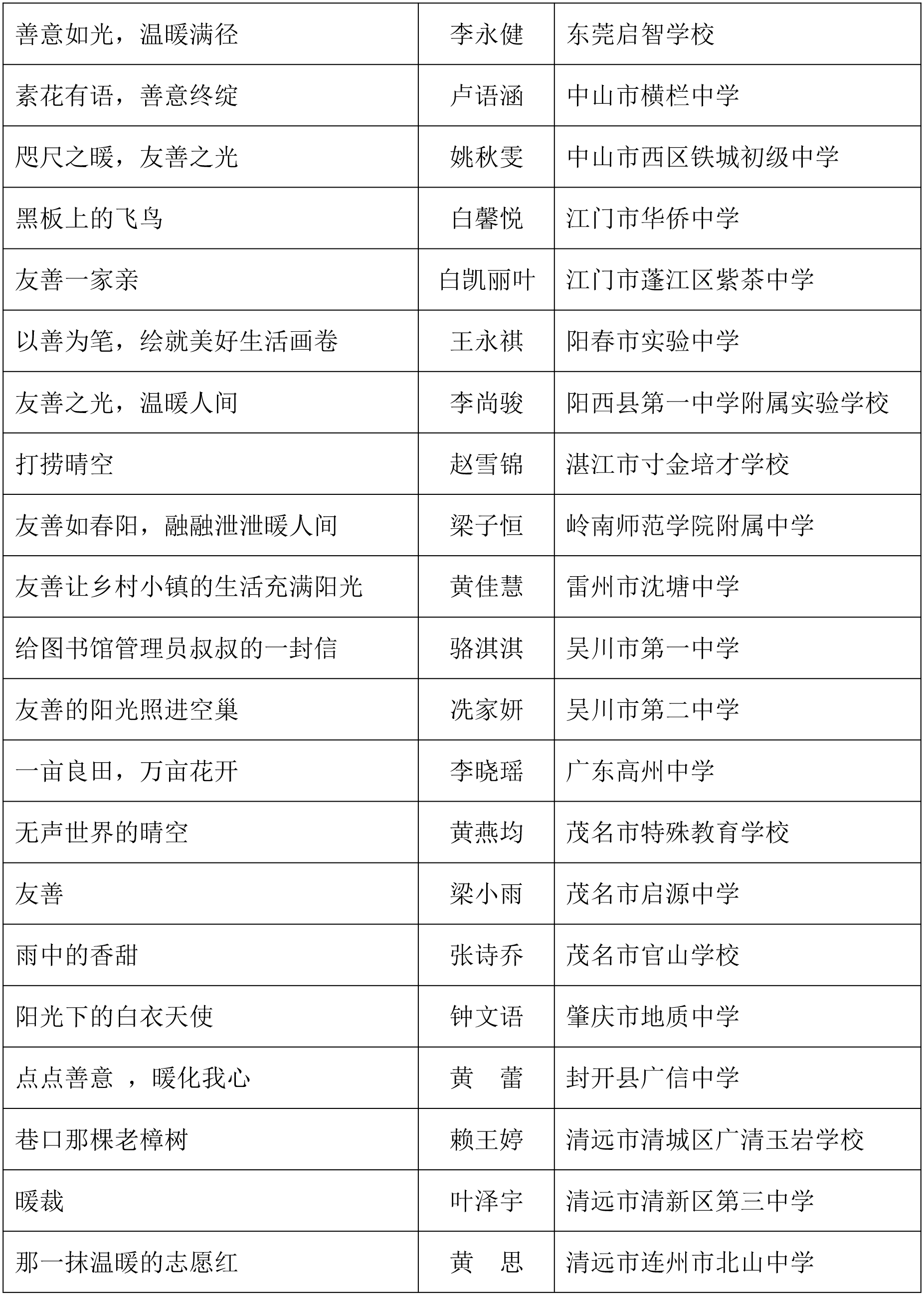 由广东省关心下一代工作委员会、广东省作家协会、广东省教育系统关心下一代工作委员会主办,《秋光》杂志社承办,《少男少女》杂志社协办的2025年广东省少年儿童践行社会主义核心价值观主题征文活动,于今年2月启动,在全省各级关工委、作家协会、教育部门和广大青少年的共同努力下,取得丰硕成果。参与征文活动的青少年达130多万人次,经各地市初评后报送组委会的文章共5868篇,组委会组织了由作家、编辑和教育工作者组成的专业评审队伍,本着公平、公正、公开的原则,通过复评和终评,按照小学、初中、高中三个组别各评出一、二、三等奖及优秀奖共620篇。其中,高中组一等奖5篇、二等奖10篇、三等奖30篇、优秀奖50篇;初中组一等奖10篇、二等奖25篇、三等奖70篇、优秀奖110篇;小学组一等奖15篇、二等奖35篇、三等奖100篇、优秀奖160篇。