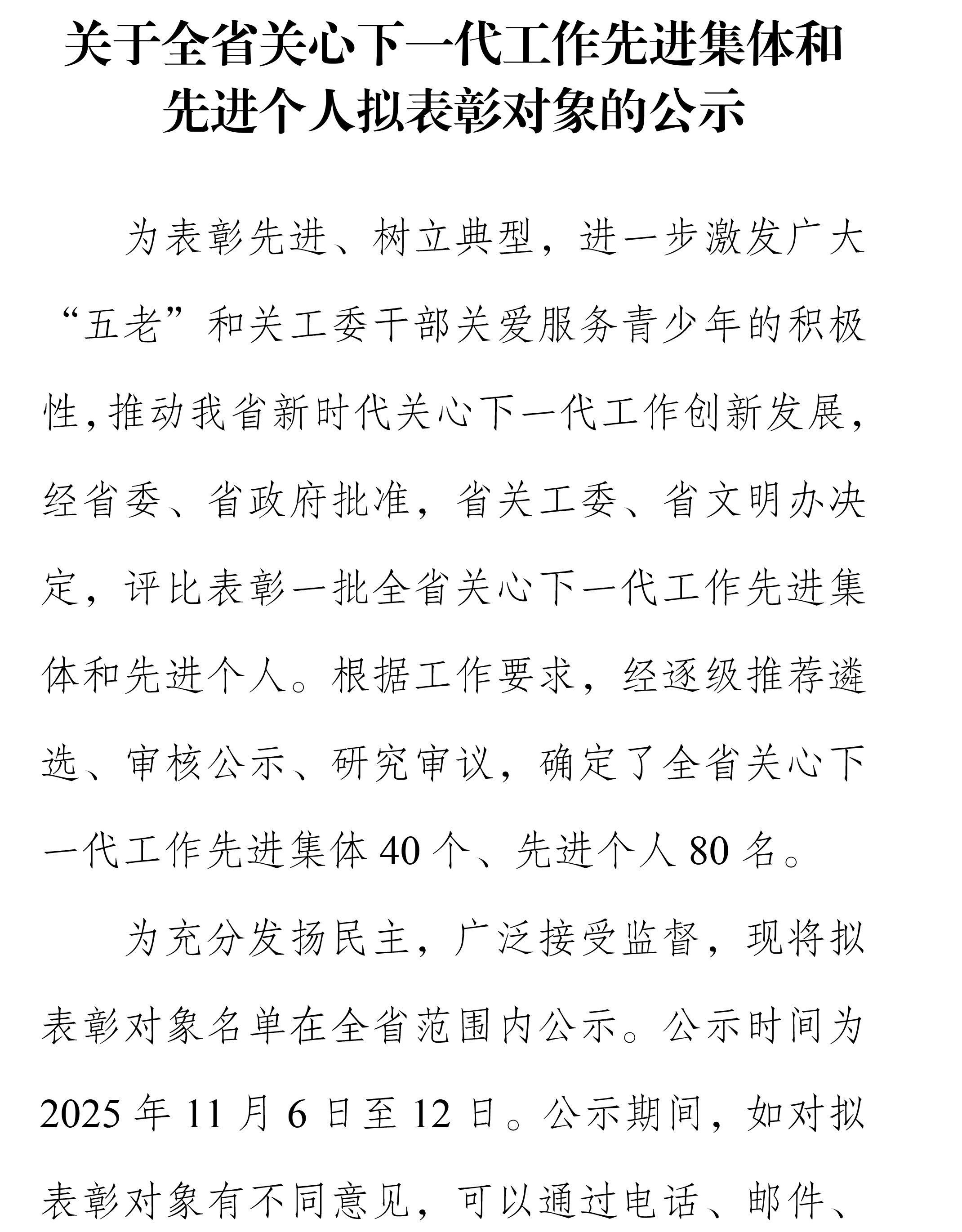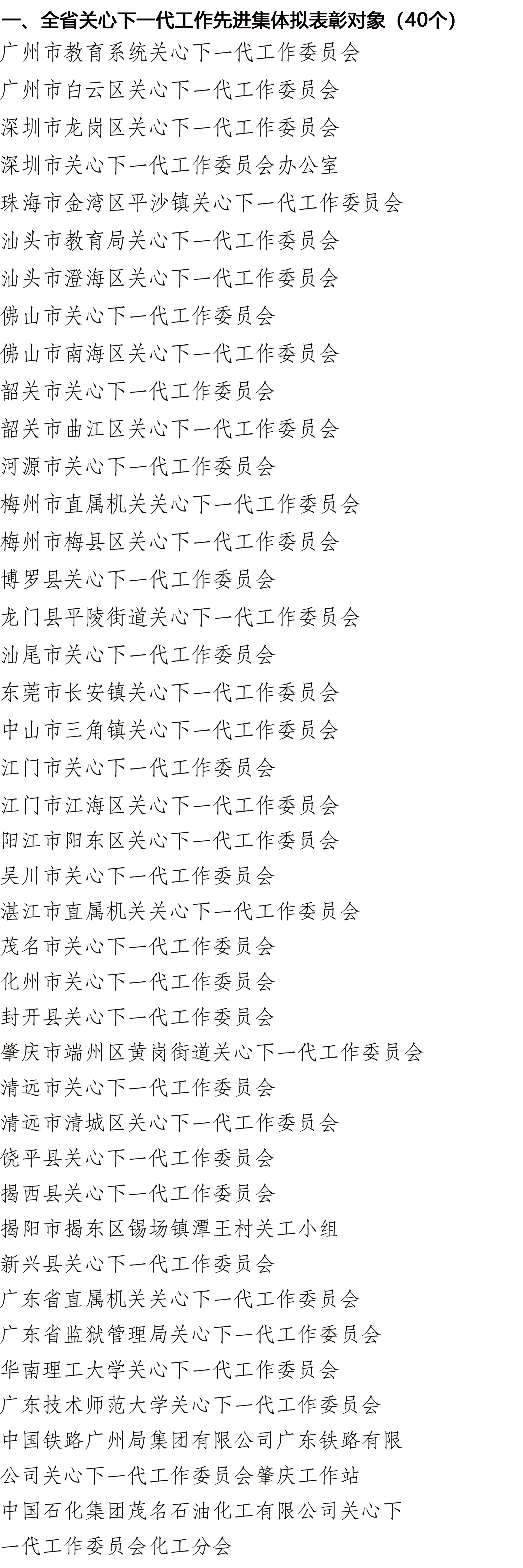 关于全省关心下一代工作先进集体和先进个人拟表彰对象的公示