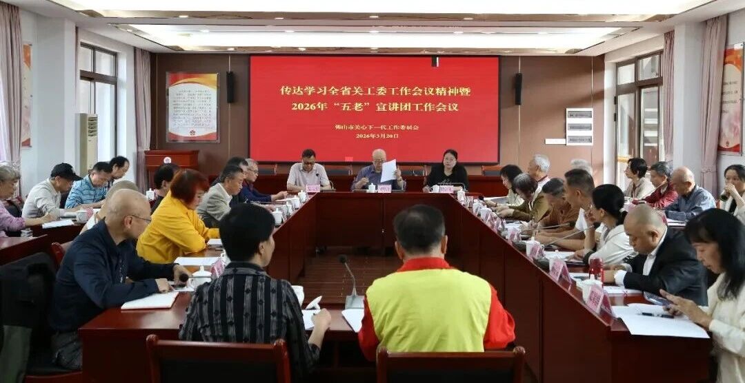 3月20日上午,佛山市关工委召开传达学习全省关工委工作会议精神暨2026年“五老”宣讲团工作会议,会议全面总结2025年宣讲工作,传达贯彻上级会议精神,交流分享工作经验,部署新一年的宣讲任务。市关工委班子成员,市关工委“五老”讲师团,各区、市直机关、市教育局、佛山大学关工委相关负责同志出席会议。